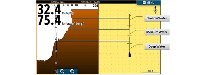 Линия разделена на сегменты с цветовой кодировкой, обозначающей глубокую, среднюю и мелкую воду, с настраиваемыми диапазонами глубин в соответствии с осадкой вашей лодки.