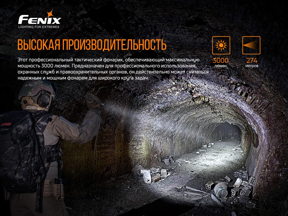 Фонарь модели Fenix PD36TAC является тактическим прибором, который пригодится вам в разных видах активного отдыха и туризма. Обеспечивает наибольший световой поток в 3000 люменов, а дальнобойность луча достигает 274 метров. Применённый светодиод – Luminus SST70. Срок службы такого светодиода достигает 50 тысяч часов. В комплекте вместе с фонарём предусмотрели литий-ионный аккумулятор 21700. Управление осуществляется через запатентованную двухфункциональную кнопку, которая производит мгновенную тактическую активацию.