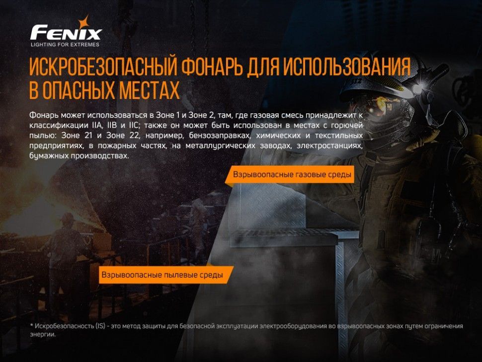Модель Fenix WF30RE является взрывозащищённым фонарём, использовать который оптимально везде, где существует угроза взрыва. Исключение составляют подземные шахты. Фонарь протестировали, и он получил сертификаты, такие как IECEx, ATEX, CSA, NEPSI. Подходит для применения в Зоне 1 и Зоне 2, где газовая смесь относится к классификации IIA, IIB и IIC. Также можно использовать в местах с горючей пылью. Это могут быть Зона 21 и Зона 22, а конкретнее: заправочные станции, химические и текстильные предприятия, пожарные части, металлургические заводы и прочие.